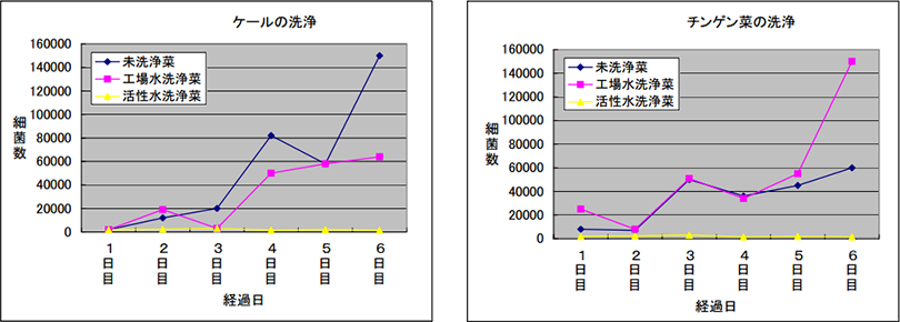 細菌数陰性の井戸水と同エルセ処理水で野菜を洗浄し、保存温度25℃±5℃の条件で細菌の増殖数を比較