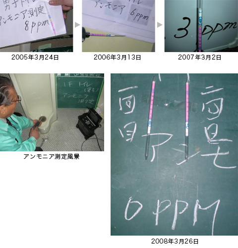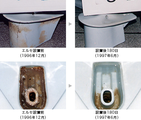 トイレ環境の改善対策として給排水管保全装置エルセを設置して、エルセの尿石除去及び再付着防止効果を検証した際のデータ。